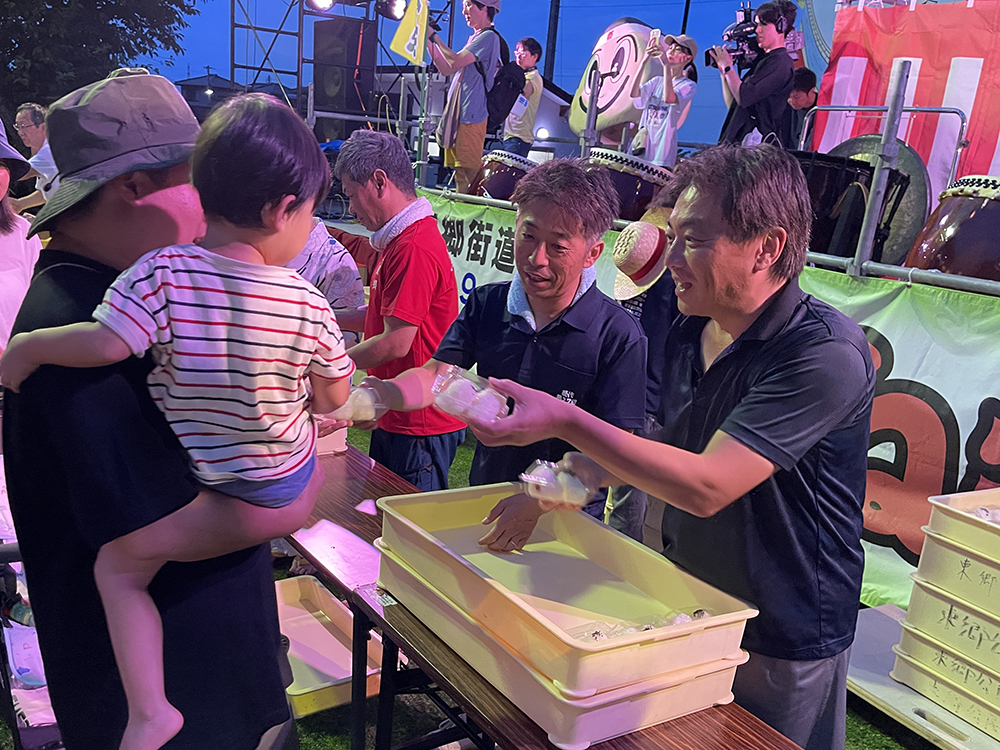 祭りは地区のPRだけでなく、災害時に住民が集結し、スムーズに配給ができる訓練になるようにと、おつくねを握って振る舞っています。