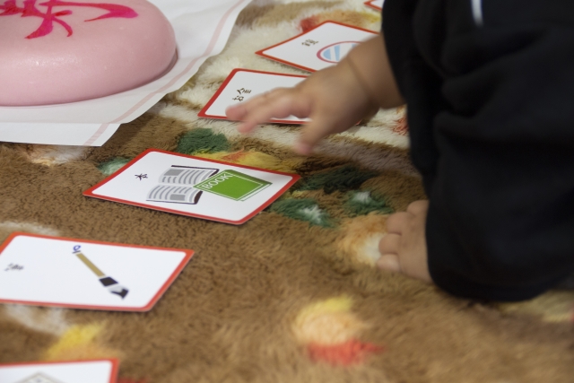 筆、そろばん、お金などのアイテム(またはカード)を並べ、赤ちゃんが最初に何を手に取るかで将来の職業や才能を占います。