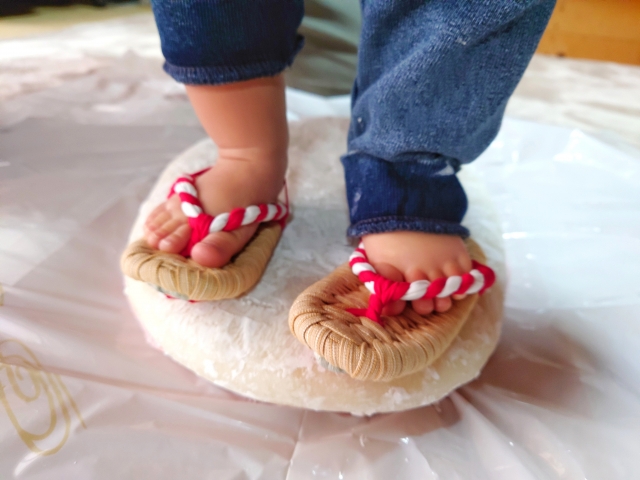 わらじを履かせてお餅の上に立たせたり、踏ませたりすることで「地に足をつけて歩んでいけるように」と願います。ご実家の風習に合わせて、背負うのか踏むのか(あるいは両方やるのか)を決めるのも素敵ですね。